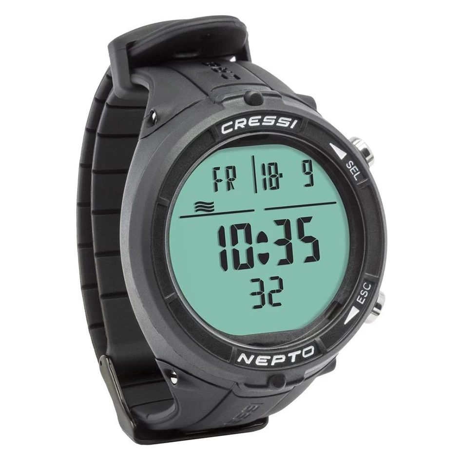 Avec un boîtier de seulement 48 mm de diamètre et un affichage très contrasté de 35 mm, la Cressi Nepto est une montre-ordinateur extrêmement compacte et spécifique pour les plongées en apnée.